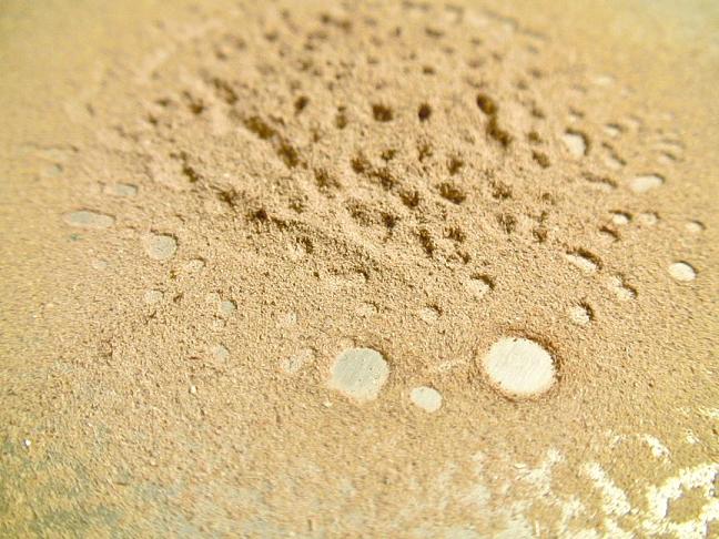 ![]() This image is from cap-plate version of experiment. Here the craters in the center are in deep material and formed without the probe reaching the surface. | ![]() This is from the single-plate version. The probe had to be held in the material in the central area of the mound in order to coax an arc. The two large craters were from numerous arcs to the plate, all remaining in the center of the cleared area. |