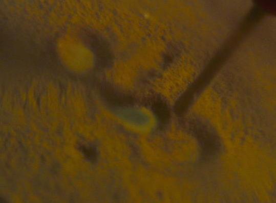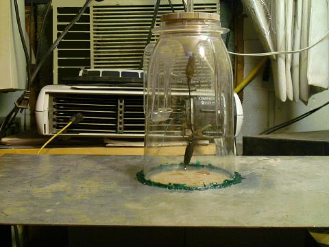 The probe movement during evacuation of the chamber was a problem that showed up as elongated craters. The solution is a different chamber. I was able to acheive 16 inches of vacuum with this one. I'm still pondering the results at these lower pressures so another picture is all I've got for now. The feature under the probe in image dsc200 was made with about 10 in vac. The lobes were made by swinging the probe.