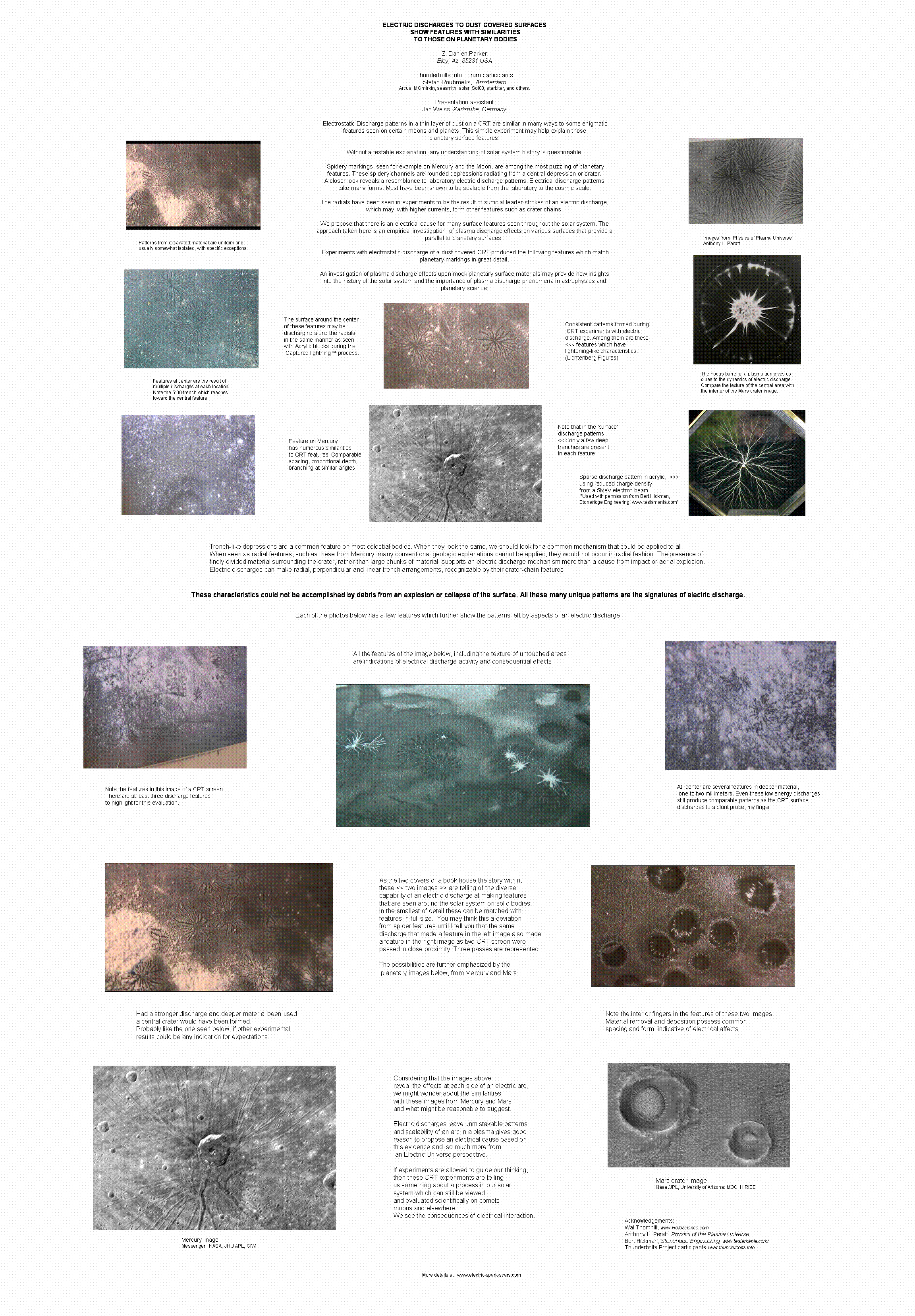 Getting back to the electrical mechanism which can cause planetary features, this mechanism, Electrical Discharge Machining, has been used in labs to create similar features as those seen on Mercury and elsewhere. The low energy experiments with electrostatic discharge produce the spidery radial features with regularity. To get the type of central crater in the image above, the high energy experiments are needed. The defining line between energy levels is not that absolute, for even at the low energy of an electro static discharge crater features are formed, however they lack molten/elevated aspects. Basic characteristics are the same; trenches, circularity, central and perimeter concentration of material and occasionally radial trenches. These radial trenches are again the focus for now. You may note that the radial features have a softer appearance than the central crater and its largest leader trenches. The sustained discharge, once established will travel around the focal point and jump around in a chaotic manner. It can reach out a tag the surrounding surface with brief contact and produce dished craters. It can also walk across the surface and erode very pronounced trenches but there is a more subtle phase in the moments prior to the intense discharge that can really be appreciated best in low energy electrostatic experiments. Leader strokes reach out with invisible fingers ahead of the major discharge and begin the removal of material in a precise pattern. It happens so fast that slow motion is needed to see the best details. There is no visible arc in the initial interaction, just the movement of material. |