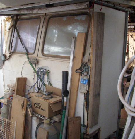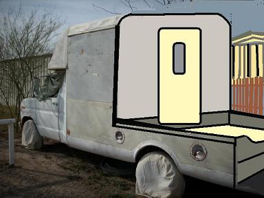 The box's walls were so soundly build that i could not bring myself to cut a side door hole or windows through them so the dual swing-out aft door frames were designed with capability of swinging a side door into place to interlock with the aft door panel. The side door has a dual direction swinging capability by either swinging the entire frame or just the door within its normal frame. It would have worked even better if i had put the support frame on a stand-off from the trucks primary door frame. Side access was accomplished in addition to an aft swing-up door or side swinging panel, accomplishing a concelment-wall to extend the truck's left wall back 6 feet for ground-level work or deck-usage. This was all a part of an aft pullout modual which