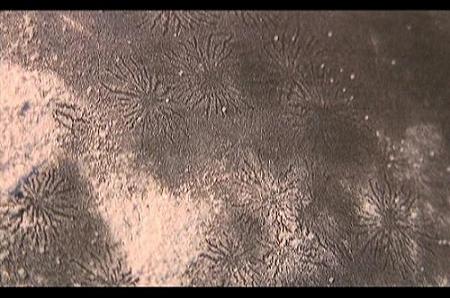 Getting back to the electrical mechanism which can cause planetary features, this mechanism, Electrical Discharge Machining, has been used in labs to create similar features as those seen on Mercury and elsewhere. The low energy experiments with electrostatic discharge produce the spidery radial features with regularity. To get the type of central crater in the image above, the high energy experiments are needed. The defining line between energy levels is not that absolute, for even at the low energy of an electro static discharge crater features are formed, however they lack molten/elevated aspects. Basic characteristics are the same; trenches, circularity, central and perimeter concentration of material and occasionally radial trenches. These radial trenches are again the focus for now. You may note that the radial features have a softer appearance than the central crater and its largest leader trenches. The sustained discharge, once established will travel around the focal point and jump around in a chaotic manner. It can reach out a tag the surrounding surface with brief contact and produce dished craters. It can also walk across the surface and erode very pronounced trenches but there is a more subtle phase in the moments prior to the intense discharge that can really be appreciated best in low energy electrostatic experiments. Leader strokes reach out with invisible fingers ahead of the major discharge and begin the removal of material in a precise pattern. It happens so fast that slow motion is needed to see the best details. There is no visible arc in the initial interaction, just the movement of material. |